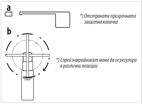 Отстранете прозрачната защитна капачка (a). Нагласете спрей накрайника в удобна за апликиране позиция (b).