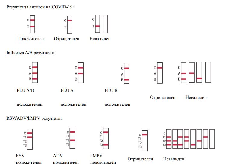 Забележка: Ако има контролна линия (C) и повече от една тестова линия, съобразете се с позицията на тестовата линия, за да определите съответния резултат. Ако липсва контролна линия (C), резултатът е невалиден.