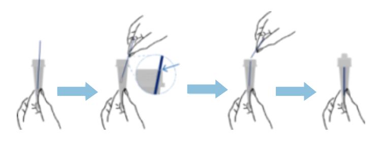 4. Поставете тампона с пробата в епруветката, след което отчупете тампона в обозначената линия и оставете долната му част в епруветката за обработка. Затворете плътно капачката.