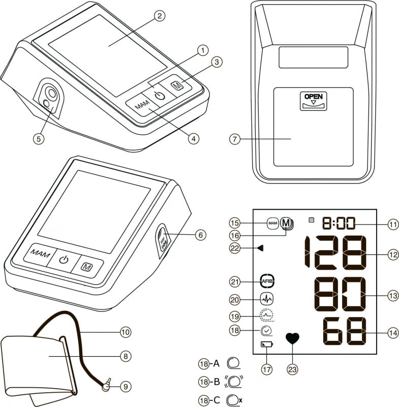 4. Проверете дали иконата за проверка на маншета (18) на дисплея показва, че маншетът е правилно поставен. Ако се появи иконата (18)-A, маншетът е поставен субоптимално, но все пак е достатъчно добре поставен и може да се направи измерване.