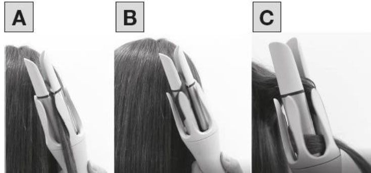 5. За да навиете частите на косата си навътре или навън, натиснете и задръжте бутона за въртене обратно на часовниковата стрелка (5) или бутона за завъртане по посока на часовниковата стрелка (6), докато частта от косата се навие напълно (изобр. B). След 12 секунди се чува звуков сигнал и къдренето вече е готово. След звуковия сигнал, издърпайте машата надолу и настрани.