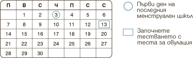 Обичайната продължителност на цикъла ми е 28 дни. Последната ми менструация започна на 3-ти. Съгласно таблицата, трябва да преброя 11 дни напред, като започна от 3-ти. Когато преброя 11 дни напред в календара, установявам, че трябва да започна да събирам и тествам урината си от 13-ти.