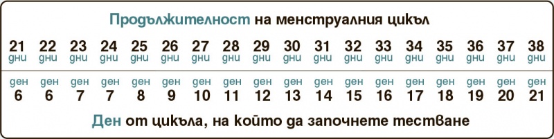 2. Определете най-подходящия ден за започване на тестването, като в първия ред на таблицата „Кога да започнете тестване“ намерите обичайната продължителност на своя менструален цикъл. След това пребройте съответния брой дни, посочен във втория ред на таблицата, започвайки от първия ден на менструацията, и започнете тестването след този брой дни.