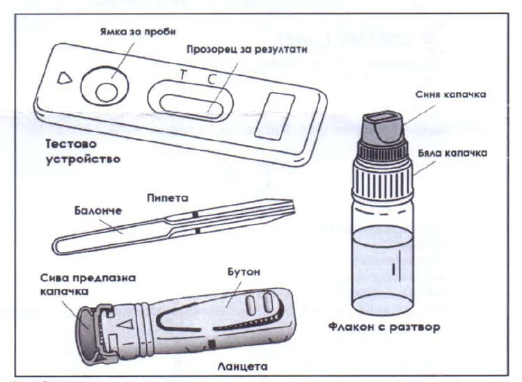 Кутията съдържа всички материали, необходими за провеждането на тест: