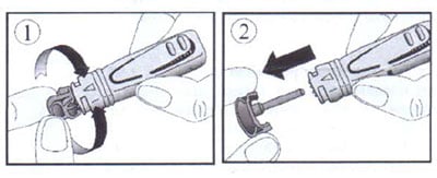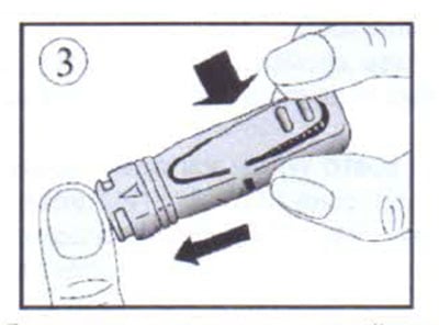 3. Подгответе ланцетата. Хванете ланцетата, без да натискате бутона-спусък. Отвийте капачето на ¼ оборот, докато усетите, че се отделя от ланцетата и продължете отвинтването (2-3 завъртания). Не дърпайте, само въртете и изхвърлете капачето, когато се отдели. Фиг. 1 и 2.