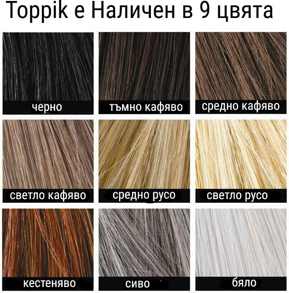 - Важно е да се отбележи, че Toppik е козметичен продукт и не повлиява растежа или регенерацията на косата. Той е предназначен за естетическо подобрение на вида на косата.